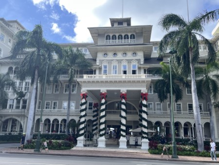 2025年12月27日(土曜日) モアナサーフライダーのクリスマスデコレーション 「ワイキキのファーストレディー」と呼ばれているホテル 正面玄関のクリスマスツリー モアナサーフライダーホテル ...