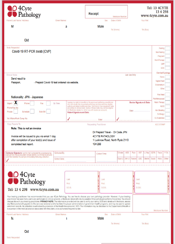 クイーンズランド州ゴールドコースト在住の執筆者は今回2022年4月の日本帰国に際し、上記一覧表内1枚目の5段目、NSW州、VIC州、QLD州向け「4Cyte Pathology」を選択しました。