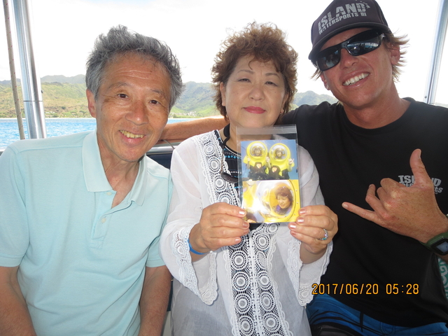 | 数十年前にWifeと娘がBob水中スクーターに乗りました。その時の写真をキャプテンに見てもらいました。今回は2人でBob水中スクーターに乗りました。大量の魚が寄って来て、触ることが、できました。亀も見れたのでラッキーでした。泳ぐこともでき、楽しく過ごせました。日本に帰りBobから送られてきた画像・動画を見てBob水中スクーターに乗ったことが再度実感しました。 | |||||