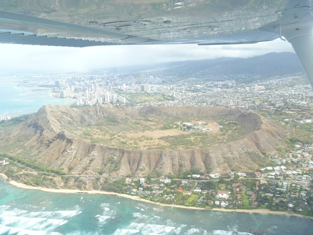 | 新婚旅行以来6回目のハワイ旅行ですが、前回の2年前に来た時に、一度空からのハワイを見てみたいと現地で申し込みましたが、旅程の都合で予約できず、今回ぜひともセスナの遊覧飛行をすべく事前に予約しました。飛行中は風の向きで少し揺れましたがとくに問題なく、地上でのドライブでは見れないオアフ島の紺碧の海と空、緑と茶褐色の山地を空から見ると新たな感動を覚えました。また、パイロットの方の太平洋戦争開戦時の真珠湾攻撃の飛行ルート等、興味深い説明も聞き、大変有意義な遊覧飛行を楽しみました。 | |||||