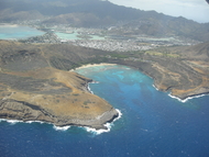 | 1時間の遊覧飛行に参加しました。 乗り物酔いをしやすいのに酔い止めの薬を飲み忘れてしまって、最後の15分くらいはぐったりでしたが、普通は見ることの出来ない空からの景色は最高でした!! 写真はハナウマ湾です。 | |||||
